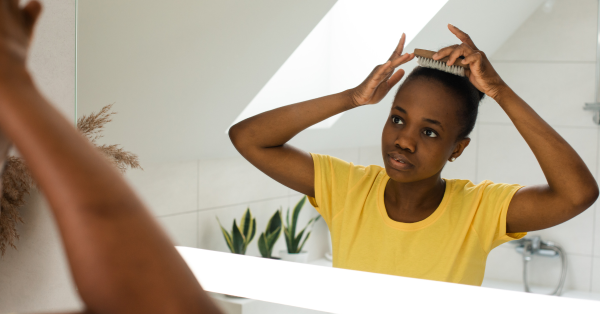 Herbal hair rinses can deep cleanse the hair, enhance natural hair color, soothe irritation, prevent dandruff, and stimulate the scalp to promote growth. To get use our herbal tea rinse, simply boil water, and add the herbs (only a handful) in hot water, steep the herbs for an hour or overnight and strain the residual liquid. Herbal tea rinses also have antibacterial, antiseptic, and antiviral properties, which can help with an itchy scalp.